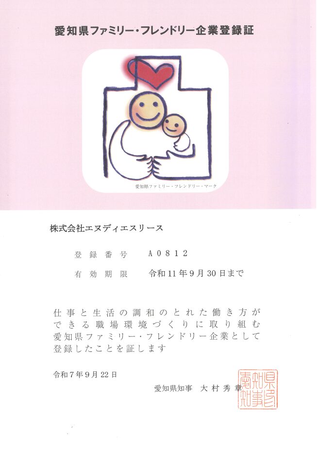 この度、仕事と生活の調和のとれた働き方ができる職場環境づくりに取り組む「愛知県ファミリー・フレンドリー企業」として登録いたしました。